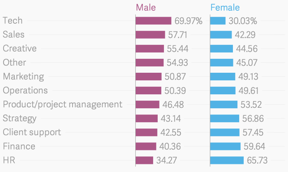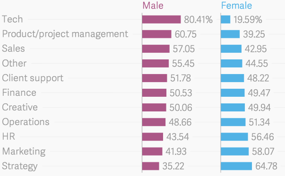 Non-startups also have a gap in technology, but it’s substantially smaller. Beyond that, the gender split is pretty similar between the two types of companies.
