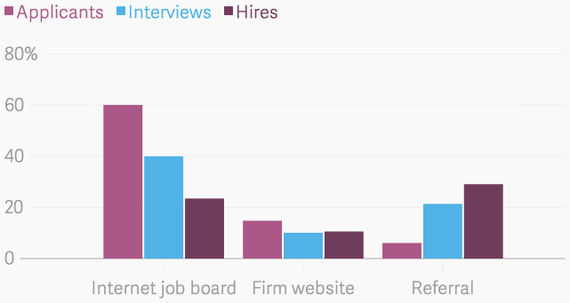 Referrals account for between 30 and 50 percent of hires in the U.S. In a paper published earlier this year, researchers from the Federal Reserve Bank of New York and MIT studied data from a financial services company, and found that while referrals only made up about six percent of total applications, they resulted in more than a quarter of hires. That’s more than the number hired via online job boards, even though those job hunters accounted for 60 percent of applications and 40 percent of interviews.