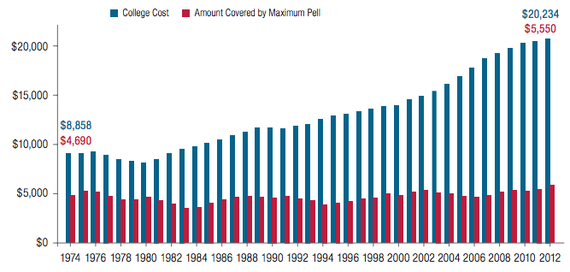 Researchers also reported that though the average cost of tuition and fees had more than doubled since 1970—from about $9,625 to $20,234 in the 2012-’13 academic year—the impact of the Pell grant, funds specifically awarded to low-income students, peaked in 1975, when the maximum award covered about two-thirds of average college costs.