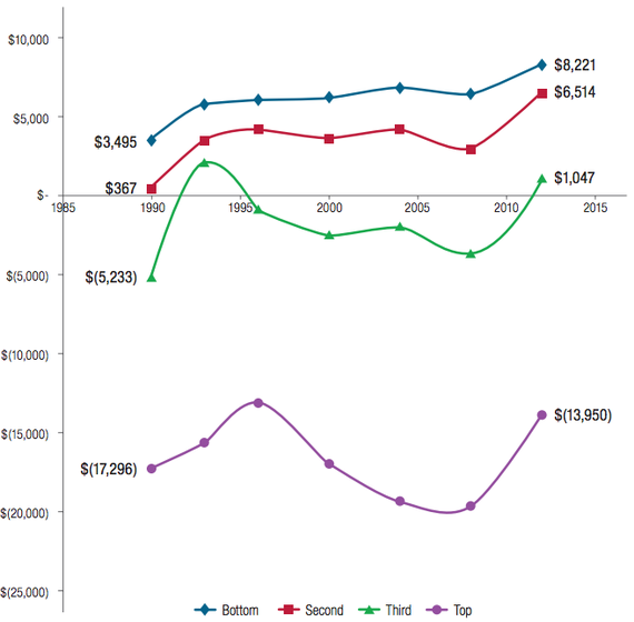 In 2012, the maximum grant covered only 27 percent of the average cost of college. And unmet financial need—that is costs after discounts, grants, loans, and expected family contribution—for families in the lowest quartile was over $8,000, that’s double the amount on unmet need in 1990. This may also explain why Pell-grant recipients were likely to wind up with more student-loan debt than their peers, despite attending lower-priced colleges. At graduation, Pell recipients owed an average of $31,007 in 2012 versus $27,443 for non-Pell recipients.