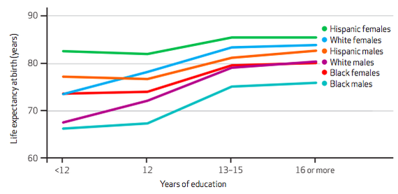 First, consider the sobering fact that many of the most disadvantaged simply die before they are eligible for their first Social Security check—a process demographers euphemistically call “selective mortality.” A recent review by public health experts puts this in perspective: "In 2008 white U.S. men and women with 16 years or more of schooling had life expectancies far greater than black Americans with fewer than 12 years of education—14.2 years more for white men than black men, and 10.3 years more for white women than black women. These gaps have widened over time."