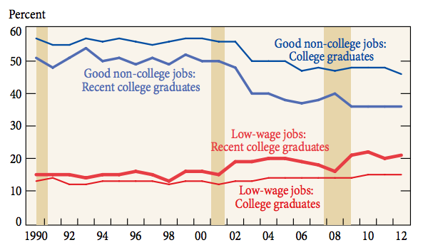 Perhaps not. When the New York Fed studied this question last year, it found that “the share of underemployed college graduates in good non-college jobs has fallen sharply, while the share working in low-wage jobs has risen.” And, perhaps more concerning, this shift seems to predate the recession.
