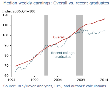 That said, just about every measure finds they are struggling mightily. The Economic Policy Institute has reported that inflation-adjusted wages for recent college graduates have fallen by 7.7 percent since 2000. Last year, the San Francisco Fed produced this graph showing wages for recent college grads essentially hitting a flight ceiling around 2008 while overall wages continued to climb, however slowly.