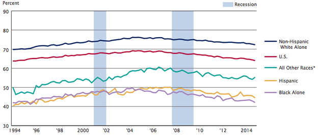 In the years since the recession, the dream of a steady paycheck and a home in a nice neighborhood have become more elusive for many working-class Americans. While some may say that the lack of homeownership reflects changing values, owning a home remains an important tool for wealth building for most families. Yet it is particularly unattainable for low-income and minority households. The homeownership rate for households that fall below median income was less than 50 percent in 2014, for those who made above the median it was nearly 80 percent. And the gap in homeownership between whites, and blacks and Hispanics is almost as large.