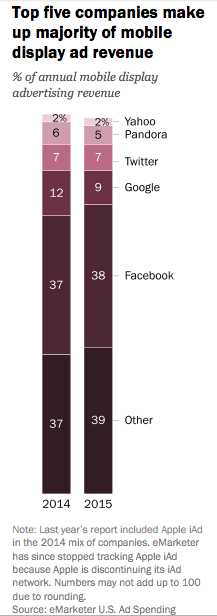 That’s precisely why anybody in the news business should be more than a little alarmed at the recent migration patterns in advertising, exhaustively documented in the Pew Research Center’s State of the News Media report. In a sentence, digital is eating legacy media, mobile is eating digital, and two companies, Facebook and Google, are eating mobile. Here is the broader scary story in four charts, from the Pew report and from other sources supporting up its main points.