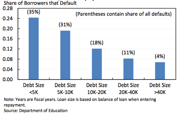 The result is this highly counterintuitive and absolutely crucial chart from the CEA, showing that students with the smallest loan burdens are the most likely to default.