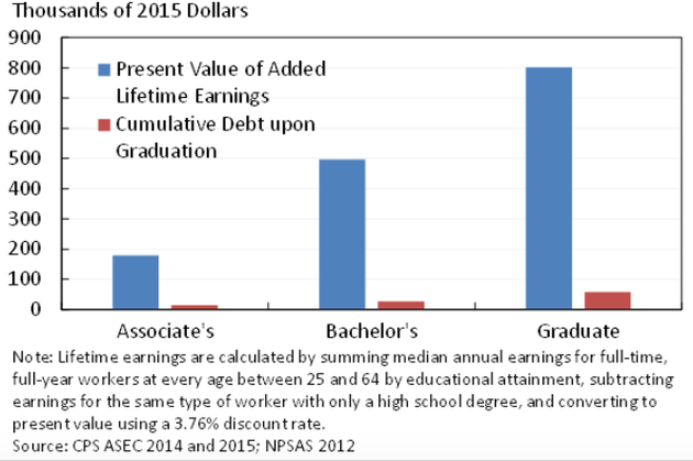 Naturally, it is impossible to know for certain if college is worthwhile for every single graduate. Some people attend college and struggle to find meaningful and lucrative work. Other adults were perhaps smart and networked enough at 18 to succeed with or without a degree. But studies comparing students from low-income families found that graduating from public college has "sizable increases" in earnings compared to those who don't attend. Even after accounting for typical debt burdens, college is largely one of the best investments a young person can make. For that reason, a student debt burden of zero is, for many high school grads, far more dangerous than being thousands of dollars in debt.