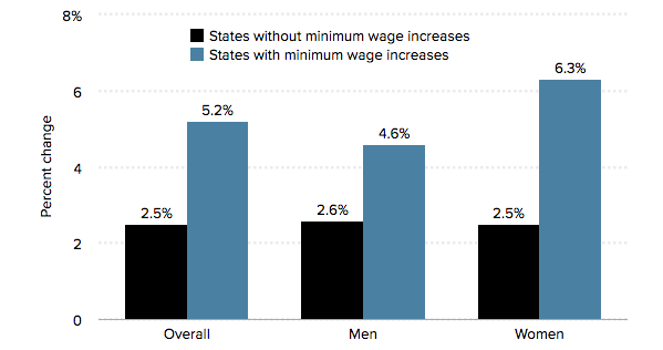 “The two leading factors are the tightening labor market and the state-level minimum wage increases,” said Elise Gould, a senior economist at the left-leaning Economic Policy Institute. Labor protests like the Fight for $15 movement contributed to minimum-wage increases in several states and cities. The impact has been obvious: Wages for the poorest 10 percent grew two-times faster in states with minimum-wage increases.