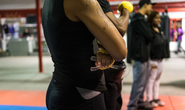 As she watched male fighters spar, Nelson stretched and yelled encouragement to both sides. She said this was an important part of her routine; it helped her get in the right mindset for her own fights. I explained the basics of the boxers’ technique to Kate Warren, the photographer I was working with, and Kate outed me to Nelson. “She’s learning to box, too, you know.”