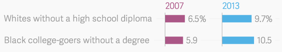 The unemployment rate for white Americans over 25 who had not finished high school was 9.7 percent in 2013. Meanwhile, the unemployment rate for black Americans who had advanced further on their educational trajectories, attending but failing to graduate from college, was 10.5 percent. That’s an increase from 2007, before the recession: