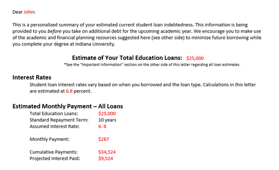 At least one university is trying to change that, however, making it easier for its students to understand their college finances. For Indiana University, a public state system with seven campuses, all it took were the distribution of personalized letters among students 2012 each individual's personal debt situation post-college. The result? $31 million less in borrowed loans over a nine-month period.