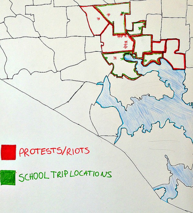 Amouri began with a geography lesson prepared by her group: “Seven of us made a map of our trip and where riots or protests happened. Violence occurred just half a mile from our hotel.” The trip was in green, the school color; violence was in red. They even made a key: