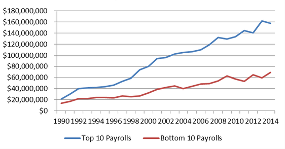 From 1990 to 2014, the top 10 highest-paid teams increased their payroll well over 600 percent. The bottom 10 also increased, but only 399 percent. In other words, not only do higher-paid teams perform better, but the bar to become a higher-paid team has become increasingly difficult to clear.