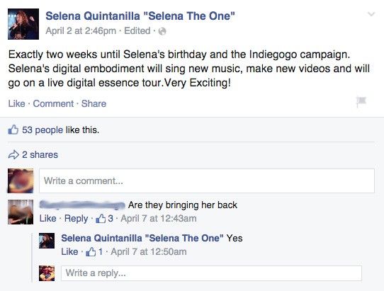 People shouldn't use the word “hologram” to describe the effort to create a walking, talking, singing, and touring CGI version of the dead pop star Selena Quintanilla. The animation process, according to the press release sent out by her family, is more advanced than that. "Using detailed individual personalized functions spanning the mind, brain and body, the individual's Digitized Human Essence will autonomously learn and react on behalf of its human counterpart's," explains Acrovirt LLC, the Nevada company that’s partnering with the Quintanilla family. The Digitized Human Essence has a name, Selena the One, and fans can soon make IndieGogo donations to help bring it—her? no, let's not say "her"—into existence.