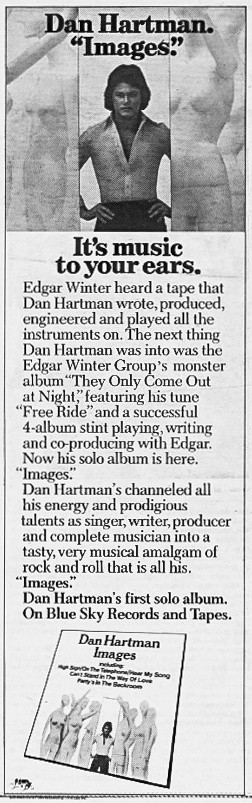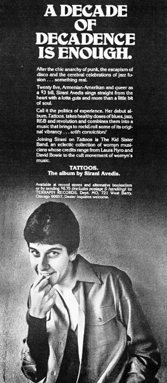 Genre and politics also made for useful ad grist. The mainstream began fragmenting with ever more genres, leading to the fan wars over “realness” that still rage today—progressive rock vs. “MOR,” guitar-lovers staging “disco sucks” demonstrations, etc. Identity and gender were increasingly hot topics as well. This ad for Sirani Avedia, from a late 1979 Rolling Stone issue, just about hit upon every talking point the preceding 10 years had produced: