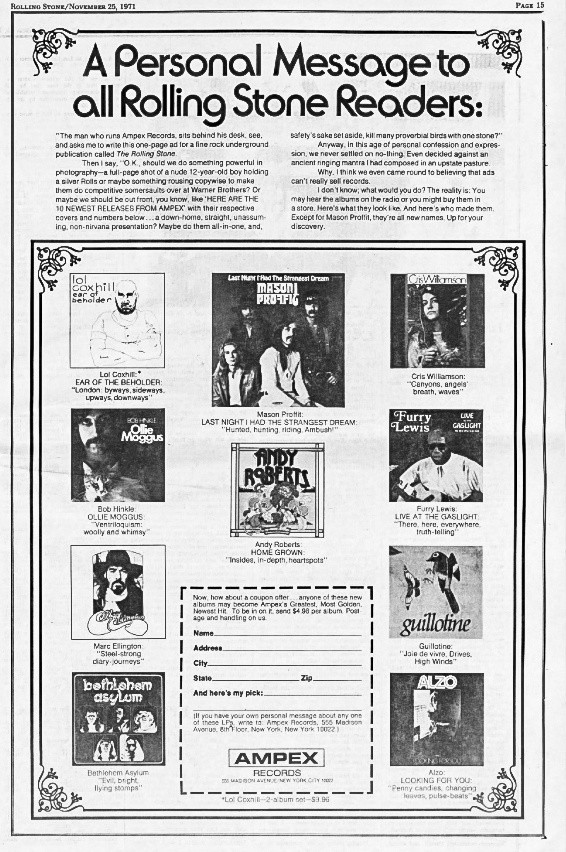 Flip through the music magazines published today, and the album ads that still exist are almost entirely image-based, or else feature a couple of quotes from favorable reviews. Which makes sense, given both the distribution changes for music, the shift in pervading ad styles—fewer words!—and the obvious pitfalls of trying to pitch records that the reader couldn’t yet listen to. The ad writers themselves, even in the ‘70s, were aware of the strange task before them. The one below tells a short story of being asked to write a Rolling Stone ad for Ampex records.