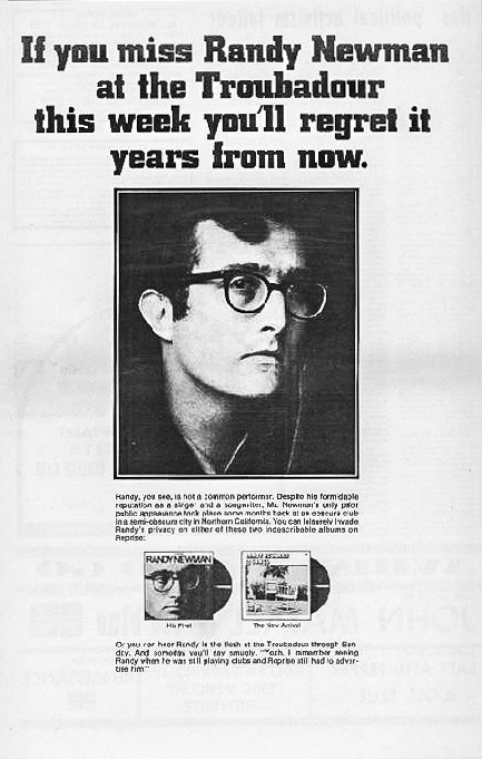 The most direct inspiration for the Jesso poster was a promo for Randy Newman in concert. The parallels are obvious, and like many of the ads of its era, it couldn’t help but be a little meta. The text promised that one day, the people who went to watch Randy Newman live could brag, “I remember seeing Randy when he was still playing clubs and Reprise still had to advertise him.”