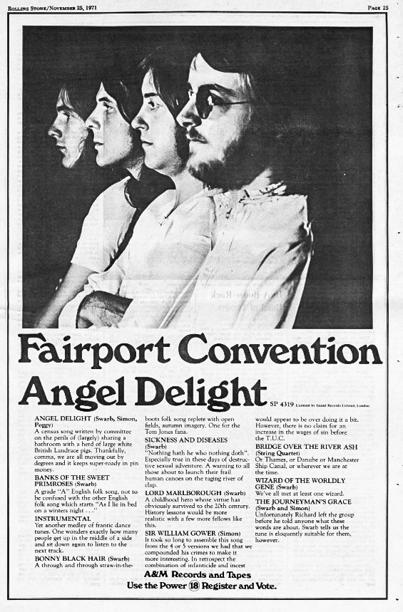 Other copywriters made spirited attempts to sound like authentic, gonzo record reviewers. The track-by-track description of Fairport Convention’s Angel Delight set out to prove that ads could be as hip and filthy and in tune with the counterculture as anything. One song is referred to as “a warning to all those about to launch their frail human canoes on the raging river of clap.”