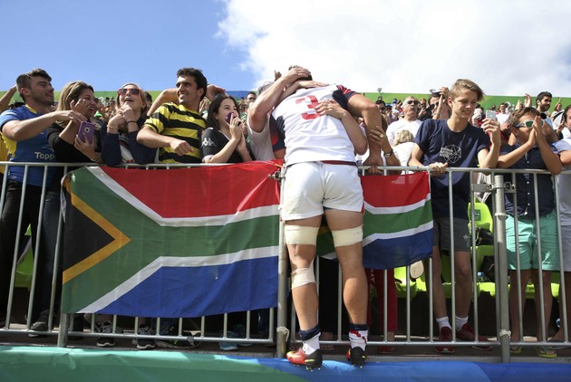 Danny Barrett of the USA hugs a fan in the stands after the men’s rugby match against Spain. (Alessandro Bianchi / Reuters)