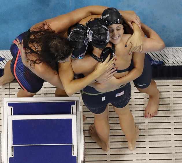 The United States team hugs after winning the gold medal in the 4 x 200m freestyle relay finals. (Morry Gash / AP)