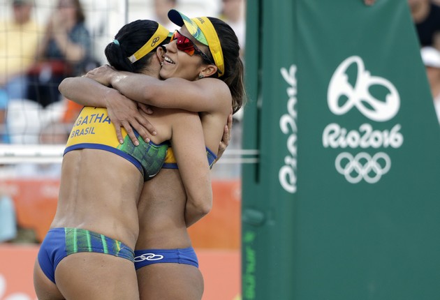 Brazil's Barbara Seixas de Freitas, right, hugs teammate Agatha Bednarczuk during a beach volleyball match against the Czech Republic. (Marcio Jose Sanchez / AP)