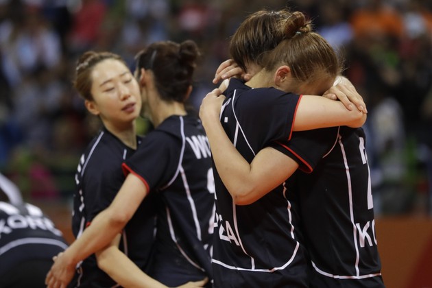 South Korea's Jung Yu-ra, foreground left, embraces team mate South Korea's Gwon Han-na after winning the women's preliminary handball match between the Netherlands and South Korea. (Matthias Schrader / AP)