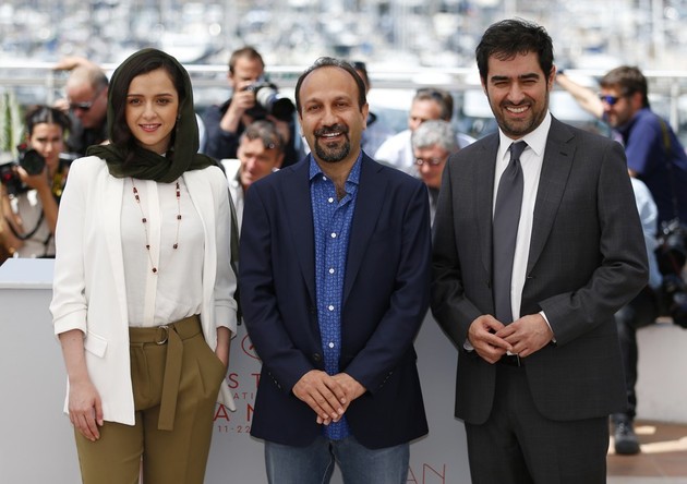 The Iranian director Asghar Farhadi (center) and the co-stars of his film The Salesman, Taraneh Alidoosti (left) and Shahab Hosseini at the 69th Cannes Film Festival in in May 2016. (Yves Herman / Reuters)