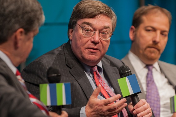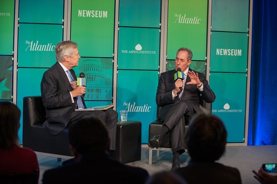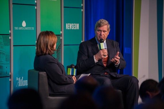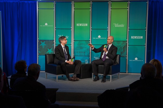 The Atlantic's James Fallows interviews United States Trade Representative Michael Froman. Anne-Marie Slaughter, CEO of New America Foundation, talks with Glover Park Group's Dee Dee Myers. Randi Weingarten, president of the American Federation of Teachers, talks about education reform. James Ryan, dean of Harvard School of Education, spoke about training the next generation of teachers. Tom Vilsack, U.S. Secretary of Agriculture, talks with Ruth Marcus of The Washington Post. Astro Teller, "Captain of Moonshots" at Google[x], speaks with Hari Sreenivasan of PBS "NewsHour." Audience members in the Knight Conference Center at the Washington Ideas Forum. John Dickerson of CBS and Slate interviews The Rev. John Jenkins, President of Notre Dame University. Sam Kass, White House nutrition advisor, talks about food marketing. The Atlantic's Corby Kummer (left) talks with former White House chef Sam Kass. David Bradley, chairmen of Atlantic Media, kicks off the afternoon session on Wednesday. Susan Rice, White House National Security Advisor, talks about the Middle East with Walter Isaacson. New Orlean's Mayor Mitch Landrieu talks about black-on-black crime. The Annenberg Theater at the Newseum was filled for the wednesday afternoon session. Uber CEO Travis Kalanick to The Atlantic's James Fallows: "D.C. is a real pain in my butt." Grover Norquist, president of Americans for Tax Reform, criticized the Tea Party's Obamacare strategy. Political gurus John Harwood, Charlie Cook, and Chuck Todd talk about--yes--the 2016 election. The Atlantic's Corby Kummer and Aspen Institute's Elliot Gerson (both facing camera) talk in the hallway.