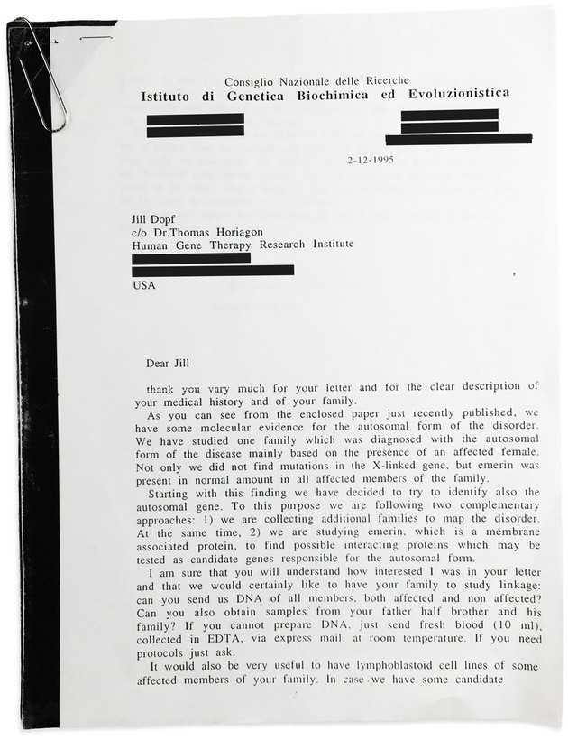 Up to that point, the Italians had only collected four other families to study, so they were thrilled to hear from Jill, and immediately wrote back. From the letter, it seems as though the Italian team thought Jill had access to a lab. Can you send DNA from your entire family? it reads. “If you cannot prepare DNA, just send fresh blood.” And then it gave mailing instructions.