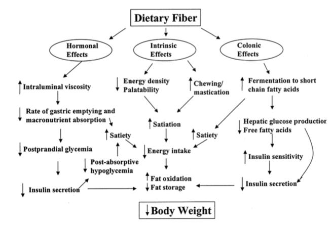 Behold, an extremely confusing flow chart, from a 2005 study, showing how fiber leads to greater satiety, less insulin secretion, and more short-chain fatty acids, which all amounts to one thing: less body weight.