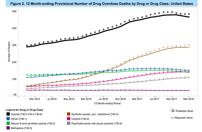 Preliminary figures reported by the Centers for Disease Control and Prevention this week show that compared with the 12 months ending September 2017, opioid deaths are down 2.8 percent in the 12 months that ended March 2018, reflecting about 2,000 fewer people who have died of a drug overdose. But, as the Associated Press points out, the final numbers for this year won’t be available until the end of next year, so we don’t know if this downward trend has continued.