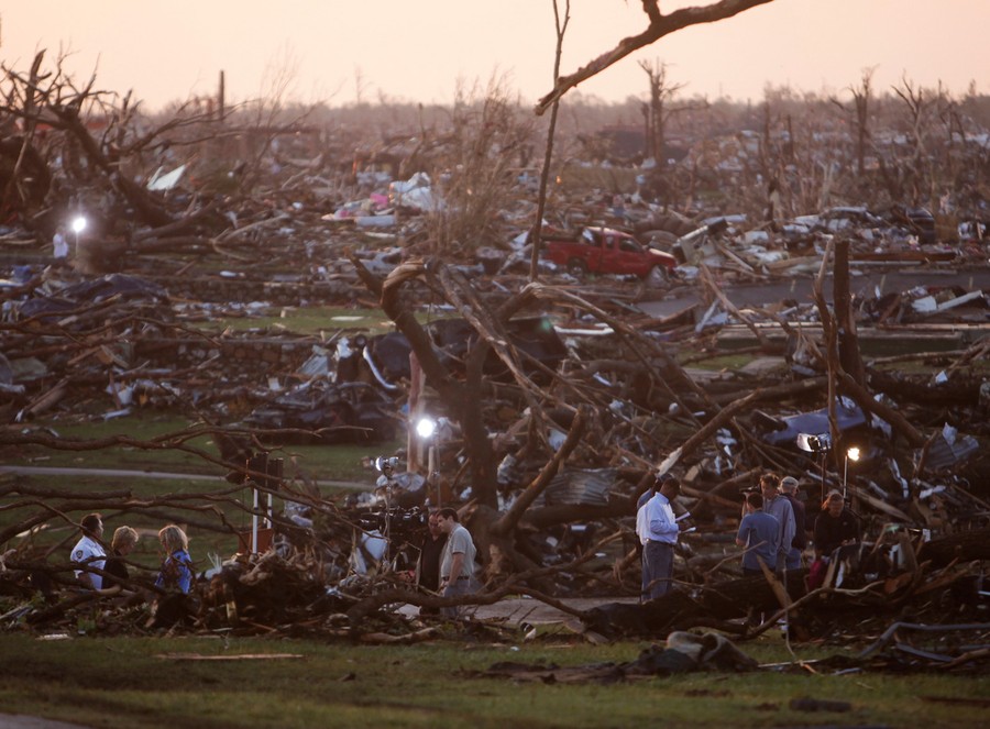 Emergency personnel walk through a neighborhood severely damaged by a tornado near the Joplin Regional Medical Center in Joplin, Missouri, on Sunday, May 22, 2011.#