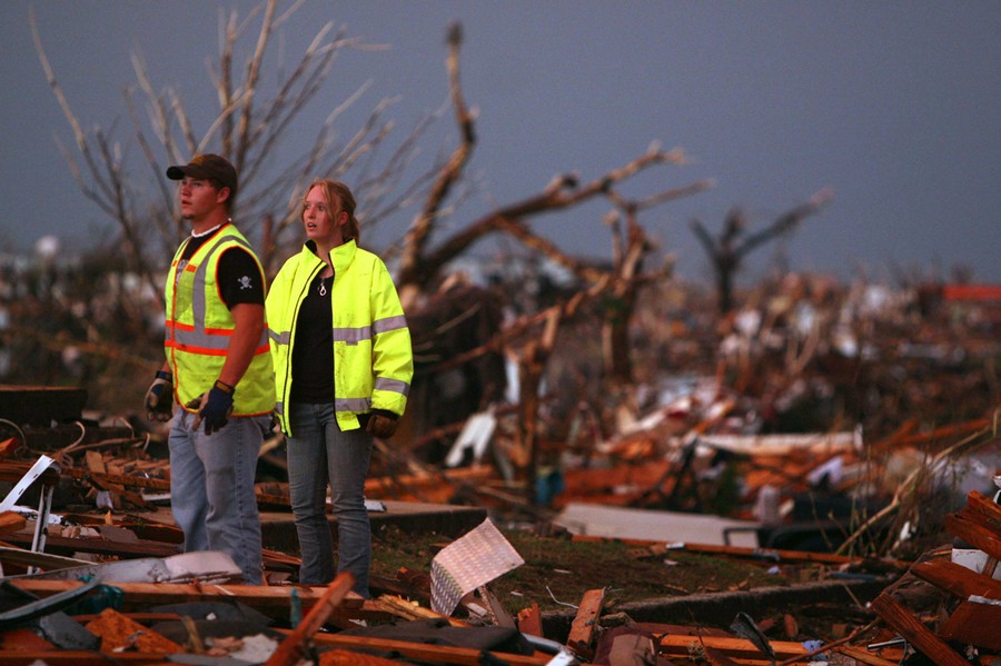 William Jackson, left, and Ashley Martin, volunteer firefighters from Oklahoma, survey the wreckage of destroyed homes in Joplin, Missouri, on Sunday, May 22, 2011.#
