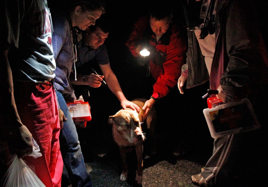 Sheila Donham (right) and volunteers tend to an injured dog as they comb a neighborhood hard hit by a devastating tornado in Joplin, Missouri May 23, 2011.#