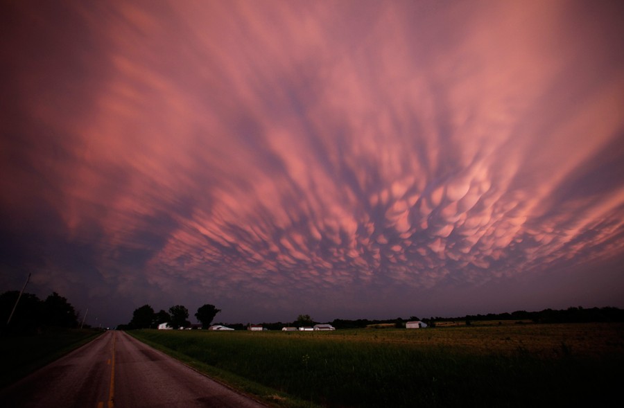 Storm clouds dwarf a farm near Lamar, Missouri, as the sun sets Sunday, May 22, 2011. The storm earlier produced a large tornado moved through much of Joplin, Missouri, damaging a hospital and hundreds of homes and businesses.#