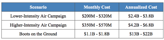 That's a multibillion-dollar "if." In September, the Center for Strategic and Budgetary Assessments (CSBA) estimated the annual costs of America's campaign against ISIS based on three scenarios of how it will evolve: 1) a low-intensity air campaign; 2) a high-intensity air campaign; and 3) a deployment of 25,000 U.S. combat forces to the region.