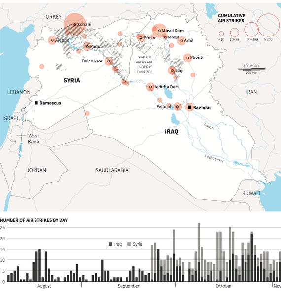 But nearly 800 airstrikes into the U.S.-led military operation, ISIS still controls sizable pockets of territory in Syria and Iraq (the shaded areas in the map below). Strikes have targeted the Islamic State's leaders and rank-and-file, but foreigners continue to join the group in large numbers, and its fighting force remains formidable.
