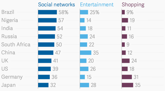 Social networking drives Internet use in the top countries. In Brazil, respondents spend 58 percent of their online time on social networking sites—a higher proportion than in any other country.