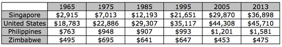 Let’s start with performance, since it is easiest to measure. As a Russian proverb declares, it is better to be healthy, wealthy, and safe than sick, poor, and insecure. Who can disagree? On these criteria, how has Singapore performed over the course of its first five decades versus the United States; or the Philippines (which the U.S. has been tutoring in democracy-building for a century); or Zimbabwe (an African analogue that declared independence from the United Kingdom just a few years after Singapore, and where dictator Robert Mugabe has been as dominant a national force as Lee Kuan Yew has been in Singapore)?