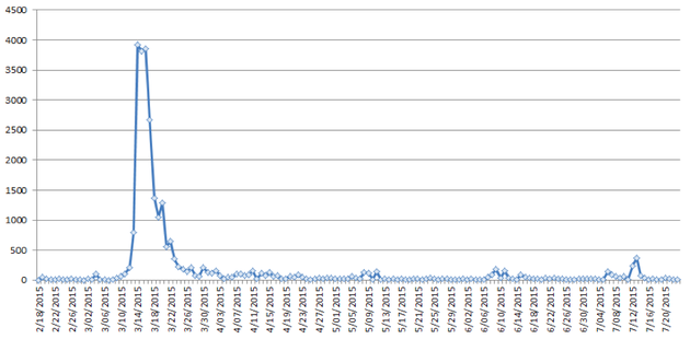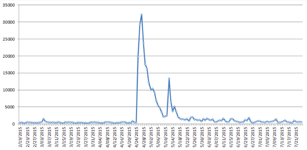In collaboration with Ben Parker of IRIN News, I recently explored how media fatigue manifested itself in global coverage of the April 25, 2015 earthquake in Nepal. The graph below shows the news articles published worldwide (primarily online, but also including a selection of print and broadcast material), in the 65 languages monitored by the GDELT Project, that mentioned Nepal at least twice in the body of the article from February 19 to July 24, 2015. (The GDELT Project is a nonprofit research initiative, supported by Google Ideas, that tries to understand global society through open information like local news media.) In total, more than 300,000 articles are represented in the graph.