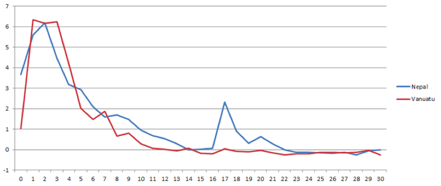 Overlaying the Nepal and Vanuatu graphs—using z-scores again to normalize, given the difference in the total number of articles about Nepal versus those about Vanuatu—the graph below shows changes in the volume of monitored media about both disasters for the 30 days following their onset (April 25 for Nepal and March 13 for Vanuatu). Both disasters produced an initial surge to six times the global average number of articles about each place, followed by a rapid decrease in coverage over the following two weeks, and then that coverage leveling off. (The second peak for Nepal reflects the second earthquake that occurred 17 days after the first.)