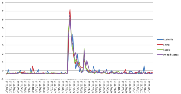 Remarkably, this timeline of dissipating attention appears to be consistent across monitored media in different countries. The graph below shows the normalized number of articles per day about Nepal from news outlets published in Australia (blue), China (red), Russia (green), and the United States (purple), representing four major media markets and three different languages. Since the total daily news output of each country is different, the timeline normalizes the raw article counts using what’s called a “z-score,” which essentially reports how far above or below average each day’s Nepal-related article count is for that country. All four countries show nearly identical rates of increased and decreased news attention devoted to Nepal, with the period of elevated attention lasting around two weeks.