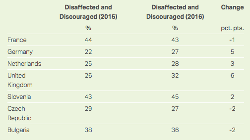 Among EU countries with elections in 2017, France is home to the second-most disaffected and discouraged voters, behind Slovenia. (In the Dutch election in March, the populist party finished in second place.)