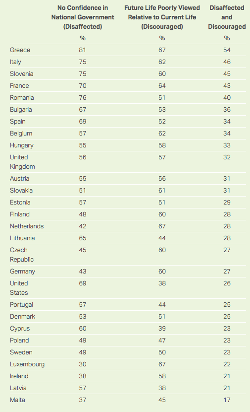 Of those surveyed by Gallup, the French are among the most likely to have little confidence in government and little hope that their life will be better in five years than it is today—with more than 40 percent of French respondents saying they feel this way. Judged by these metrics, Gallup notes, Europe in general seems more prone to populism than the United States, despite the fact that Donald Trump is currently the most prominent example in the West of a (semi-) populist leader. In 18 of 27 European Union countries, Gallup encountered a higher percentage of disaffected and discouraged people than in the U.S.