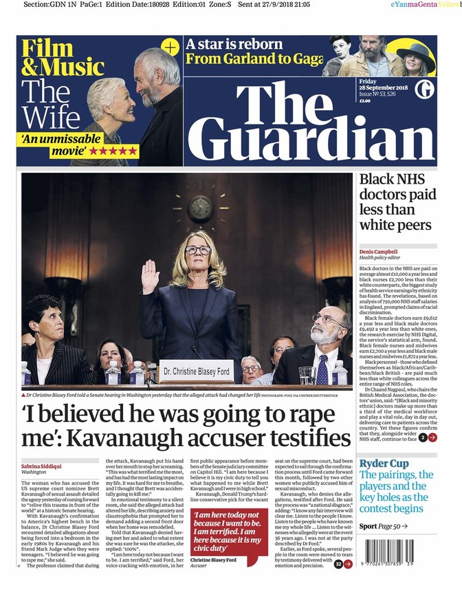 It was much more than a domestic drama. The Supreme Court is one of the most powerful institutions in the most powerful country in the world. And Ford’s tearful testimony, along with Kavanaugh’s angry rebuttal, was gripping in its own right. Proof of the hearing’s international significance was evident the very same day, when stories about Thursday’s nine-hour testimony appeared in German, French, and Spanish newspapers. In the United Kingdom, it was front-page news in several national dailies. The Guardian’s front page focused on Ford, as well as her statement to the Senate Judiciary Committee that she believed Kavanaugh “was going to rape me” in the alleged assault she said took place at a Maryland house party nearly 36 years ago. Kavanaugh has repeatedly and categorically denied that the incident occurred, including in his own testimony on Thursday.