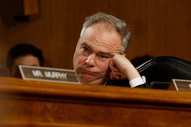 Senator Tim Kaine of Virginia listens to Rex Tillerson’s testimony on Wednesday (Jonathan Ernst / Reuters)