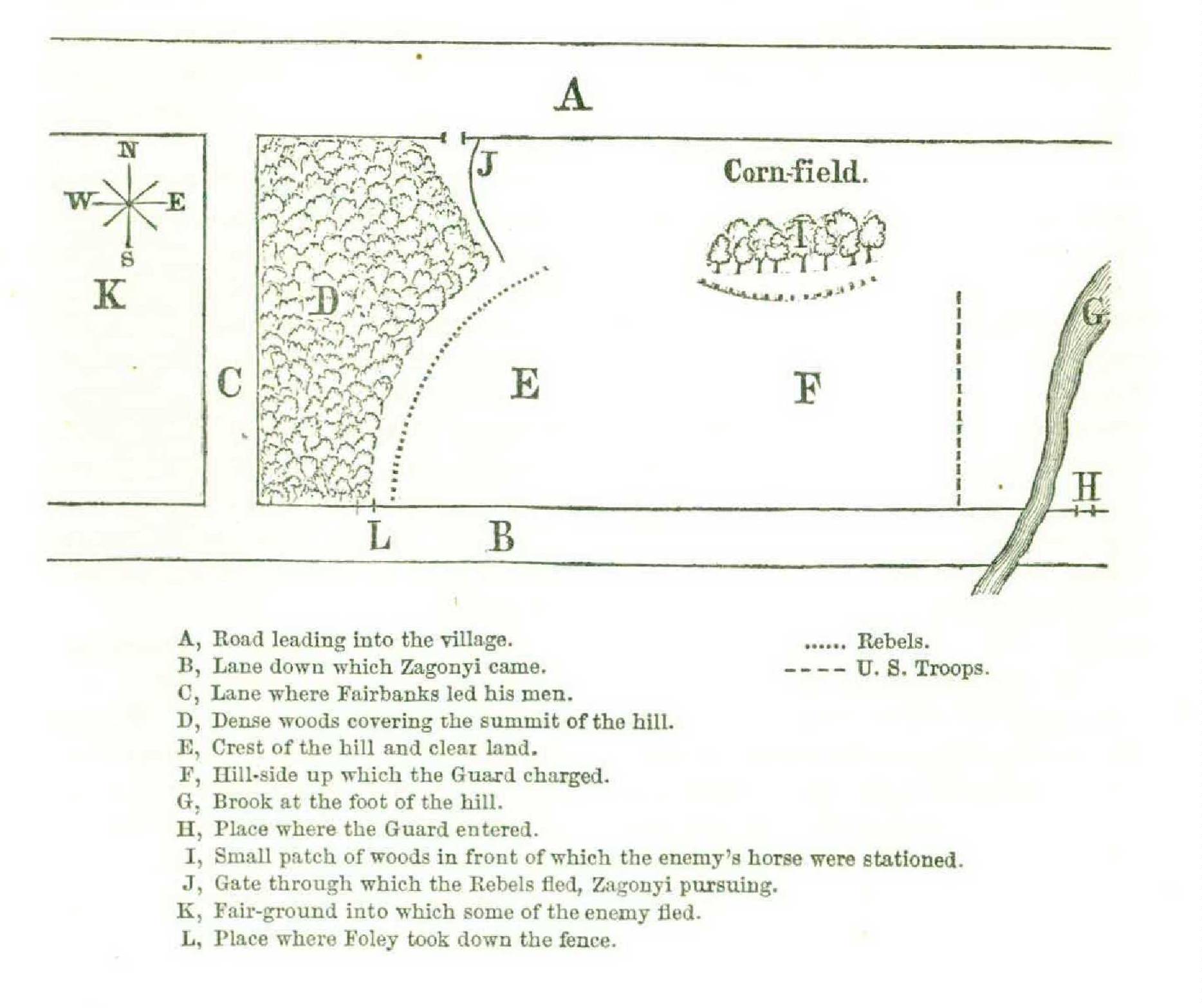 Making a détour of twelve miles, Zagonyi approached the position of the enemy. They were encamped half a mile west of Springfield, upon a hill which sloped to the east. Along the northern side of their camp was a broad and well-travelled road; along the southern side a narrow lane ran down to a brook at the foot of the hill: the space between, about three hundred yards broad, was the field of battle. Along the west side of the field, separating it from the county fair-ground, was another lane, connecting the main road and the firstmentioned lane. The side of the hill was clear, but its summit, which was broad and flat, was covered with a rank growth of small timber, so dense as to be impervious to horse.