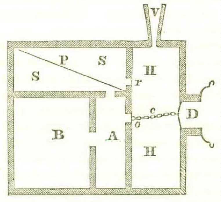 This inner suite of apartments consists of an antechamber, A, (vestibule,) an arched chamber, B, (semicircular canals,) and a spiral chamber, S, (cochlea,) with a partition, P, dividing it across, except for a small opening at one end. The antechamber opens freely into the arched chamber, and into one side of the partitioned spiral chamber. The other side of this spiral chamber looks on the hall by the round window already mentioned ; the oval window looking on the hall belongs to the antechamber. From the front-door to the oval window of the antechamber extends a chain, c, (ossicula auditus,) so connected that a knock on the first is transmitted instantly to the second. But as the round window of the spiral chamber looks into the hall, the knock at the front-door will also make itself heard at and through that window, being conveyed along the hall.