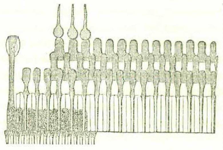 Thus the summons of Sound reaches all the watchmen, but not all of them through the same channels or with the same force. It is not known how their several precise duties are apportioned, but it seems probable that the watchmen in the spiral chamber observe the pitch of the audible impulse which reaches them, while the others take cognizance of its intensity and perhaps of its direction. Such is the plan of the organ of hearing as an architect might describe it. But the details of its special furnishing are so intricate and minute that no anatomist has proved equal to their entire and exhaustive delineation. An Italian nobleman, the Marquis Corti, has hitherto proved most successful in describing the wonderful Key-board found in the spiral chamber, the complex and symmetrical beauty of which is absolutely astonishing to those who study it by the aid of the microscope. The figure annexed shows a small portion of this extraordinary structure. It is from Kölliker’s wellknown work on Microscopic Anatomy.