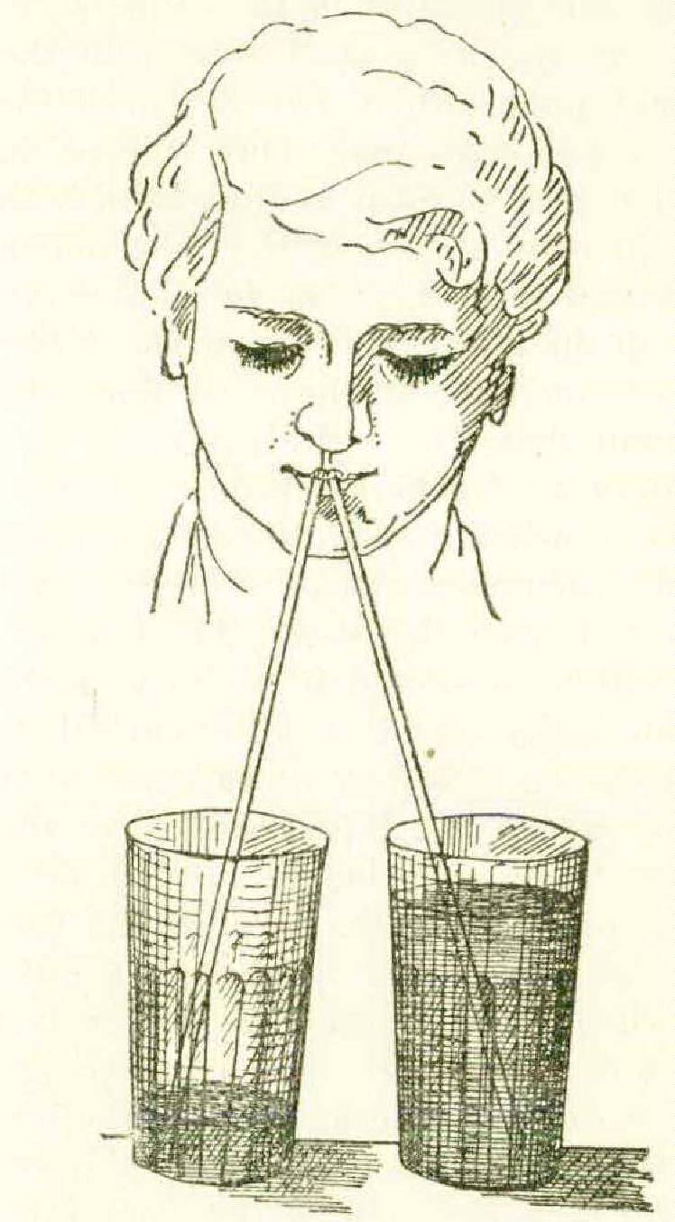 The accompanying diagram (Figure 1) shows two tumblers containing water. One is nearly filled and the other has but an inch of water at its bottom; the difference in height between the two levels of the water we will assume to be two inches. The barometric resistance (against suction) is greater, by the pressure due to a column of two inches of water, in the one than it is in the other. Into each of these two tumblers a glass tube is inserted, and the ends of both tubes are taken into the mouth at the same time. We will assume that the vertical height between the surface of the water in one of the tumblers and the mouth is four inches, and between the surface of the water in the other tumbler and the mouth is six inches; consequently in one case there is a column of four inches of water to be lifted, and in the other a column of six inches. Now if one sucks very gently on both tubes, that is, if both are slowly exhausted by the same mouth, water will flow only from the tumbler which is the fuller, or from which the shorter column is to be lifted, until the level of its water is reduced to the level of the water in the other tumbler; then, the height to be overcome being equal, there will be an equal flow from each tumbler until both are exhausted. No matter how much water there may be in one vessel nor how little in the other; if the same slow draft is made on both at the same time, the flow will always be entirely from the one standing at the higher level, and after the equilibrium is established there must be an absolute equality of level preserved until both are exhausted. The same effect will be observed if we experiment with a dozen tumblers, all having their contents at different elevations; that one in which the liquid stands at the highest level will be discharged first; when this reaches the level of the second, these two will be discharged together; when these descend to the level of the third, the three will deliver equally; and so on until the whole series, offering an equal resistance to an equal force, deliver their contents at the same rate.